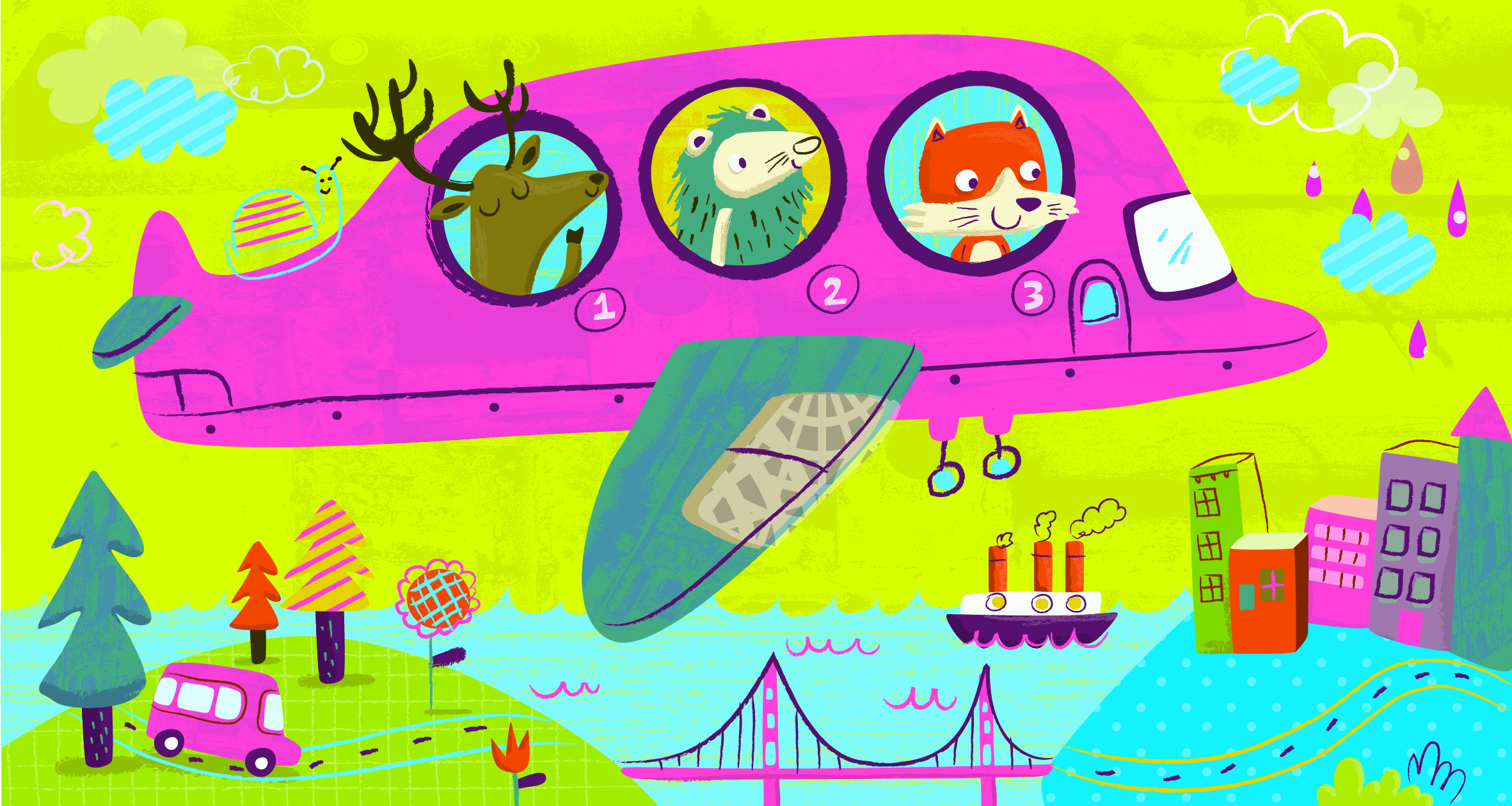 One of the things that really inspired me to become a children’s book illustrator was the work of Richard Scarry. My favorite books of his include What Do People Do All Day? and Busy, Busy Town. His characters were mostly anthropomorphic animals, which I’ve always enjoyed more than human characters. Anthropomorphic animal worlds provide an escape from reality; an illustrator can use them to create atmospheres that seem safer and more innocent than any human world. Moreover, there are lots of opportunities to add funny details to animal characters and the scenes involving them. I love adding little touches like carrot themed prints for a bunny character or fish bone prints for a cat.