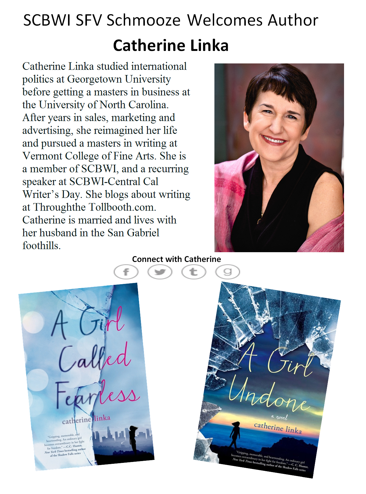 In June San Fernando Schmoozers were treated to An Evening with Author Catherine Linka. Catherine raffled off one of her books before sharing her journey from writer to author, and all the pitfalls in between. Her presentation left the Schmoozers informed and inspired.