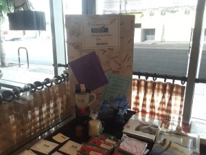 This year’s prep meeting was held in a room at a local restaurant and we were impressed by its transformation into a gorgeous brunch space. The tables were set with white tablecloths, rocks and flower center pieces, and SCBWI purple folders. A corner was adorned with prizes and giveaways. The back table was covered with a breakfast fit for hungry coordinators. We knew that Jennifer Pitts worked hard, used fairy dust and a large dose of creativity to set this up.