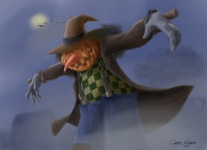 I began drawing scary animal characters, creepy clowns, and fantasy creatures. Then I hit upon a scarecrow. In books and movies, I always liked villains that didn’t necessarily appear scary — it was their behavior that was frightening. Scarecrows are fairly ordinary, but they could be presented in a menacing way. I tried several faces, a pumpkin head, even a silly scarecrow. I ultimately opted for a dramatic image.