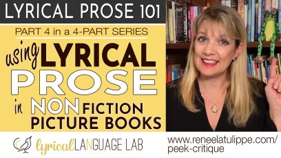 RL: Well said—lyrical language and poetic techniques go WAY beyond poetry. In fact, I think every writer should study poetry regardless of what genre she is writing in or for what age group. Think of all the elements that poetry and every other type of good writing have in common: conciseness, precise word choice, imagery, figurative language, emotional weight, storytelling, sound devices, rhythm, breath, and (sometimes) rhyme. All of these poetic techniques combine in your prose to make your writing more musical and help you create read-aloud language that will transport the reader into a world of imagination. And in the case of picture books, it helps you do all that in as few words as possible.