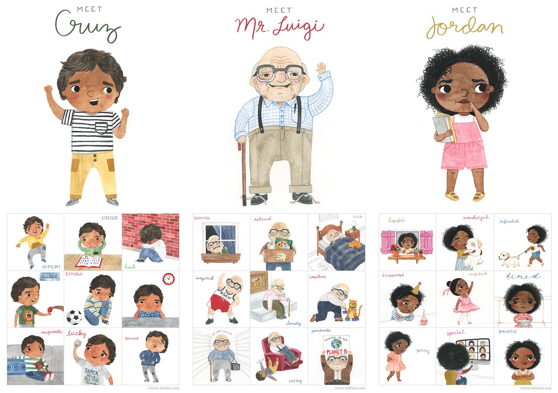 I knew there wasn’t a magical key to illustrating humans, the only way to get better at something was to practice. By now it was 2020 and 100 Day Projects continued to be popular on Instagram. I figured if I drew 100 people in 100 days there was no way I wouldn’t get better and more comfortable at drawing them. I also wanted the project to propel my children’s book illustration to the next level. So I decided my project would be 100 days of emotions.