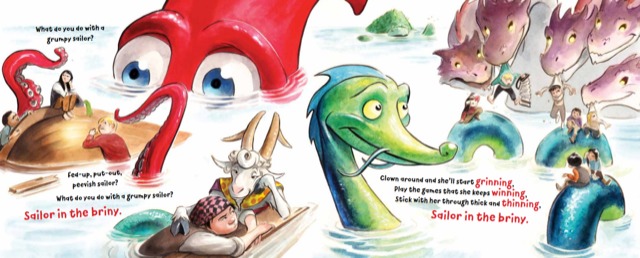 LB: The back matter was always part of the fun. Monsters in the Briny sprang from a manuscript describing a collection of fairly unusual monsters, so it seemed only fitting to include descriptions of the creatures at the end of this picture book. I submitted the story this way to Lori, and my fabulous editor at Sleeping Bear was very happy to include it. Hopefully, I managed to introduce the beasties in an entertaining way to audiences that might be less familiar with them. (I also included sheet music, since this is a song, after all, and was delighted when my editor left that in as well!)