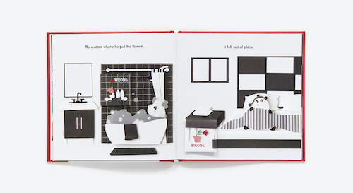 Now, the interactive element leads and the story follows. As the reader moves the flip tabs, they are actually moving the flower through the scene and seeing all the places Mr. Panda tries to place the flower. “Wrong.” “Wrong.” (Flip. Flop.) “Wrong.” “Wrong.” (Flip. Flop.) “Wrong.” “Wrong.” (Flip. Flop.) “Wrong.” “Wrong.” (Flip. Flop.)