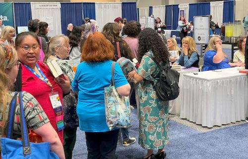 Conference attendees waiting in line to have books signed by Kerr and Van Draanen.