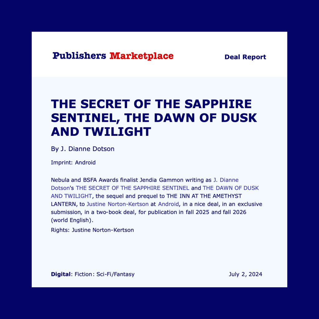 Nebula and BSFA Awards finalist Jendia Gammon, writing as J. Dianne Dotson, sold The Secret of the Sapphire Sentinel and The Dawn of Dusk and Twilight, the sequel and prequel to The Inn at the Amethyst Lantern, to Justine Norton-Kertson at Android Press in an exclusive submission, two-book deal, for publication in fall 2025 and fall 2026 (world English).