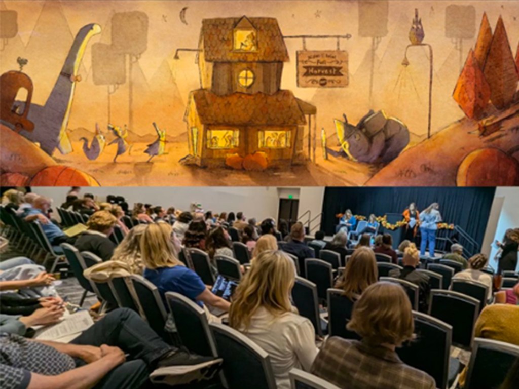 Ricardo Aguilar’s winning 2024 SCBWI Fall Harvest banner illustration welcomes a rapt audience to the info-packed event;