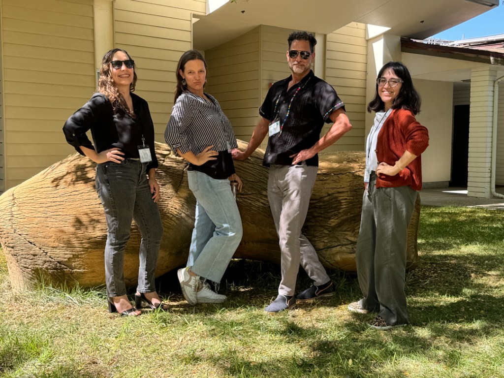 Faculty members Melanie Figueroa, Mary C. Moore, Jim Averbeck, and Jenny Lopez strike a playful pose;