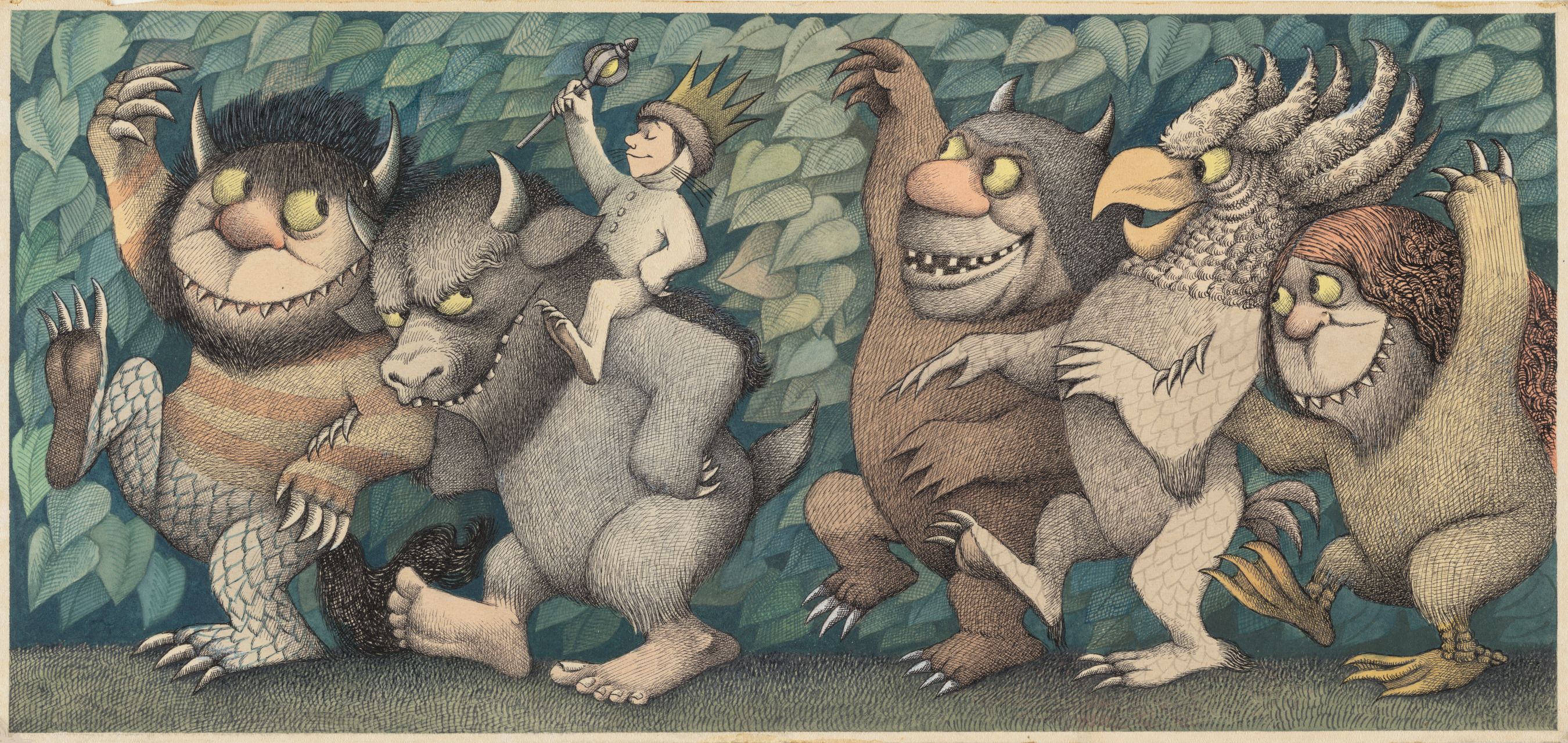 - “WTBanner” Maurice Sendak, Where the Wild Things Are, 1963, watercolor and ink on paper, 93/4 x 22 in. ©TheMaurice Sendak Foundation