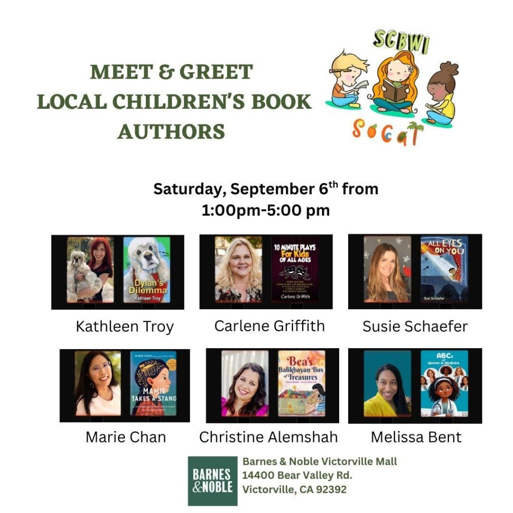After the SCBWI SoCal Illustrators group meetup, make your way over to the Barnes & Noble Victorville Mall for a meet & greet with local children’s book authors! Kathleen Troy, Carlene Griffith, Susie Schaefer, Marie Chan, Christine Alemshah, and Melissa Bent are super excited to meet folks and talk about their beautiful books!