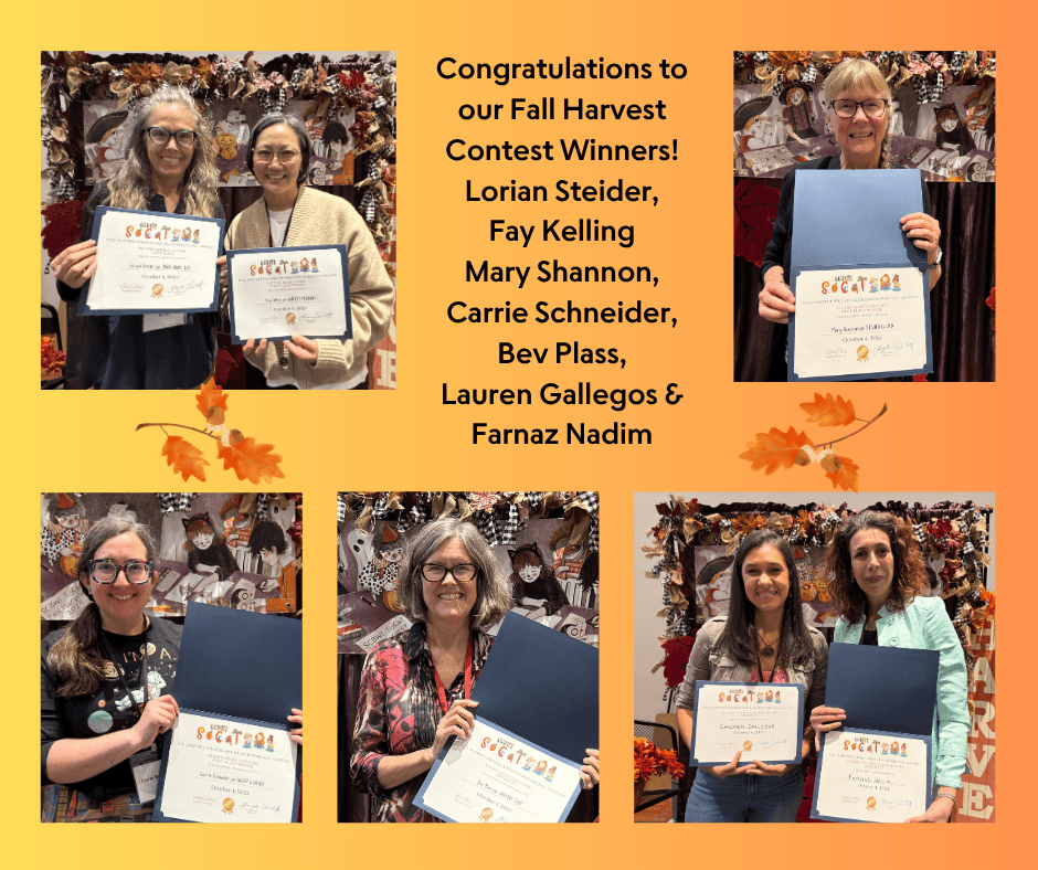 Our Fall Harvest Writers and Illustrators Day at Cal State Fullerton and online was a huge success. Attendees got to hear a day full of inspiring speakers, enter writing contests and a portfolio contest, sign up for pitches and written critiques, get live feedback during First Pages, display published books, buy books from author and illustrator presenters, and participate in our daylong icebreaker bingo game.