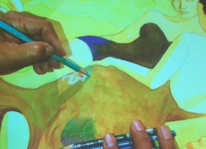 Illustrator Raúl Colón demonstrates his color layering technique during his intensive.
